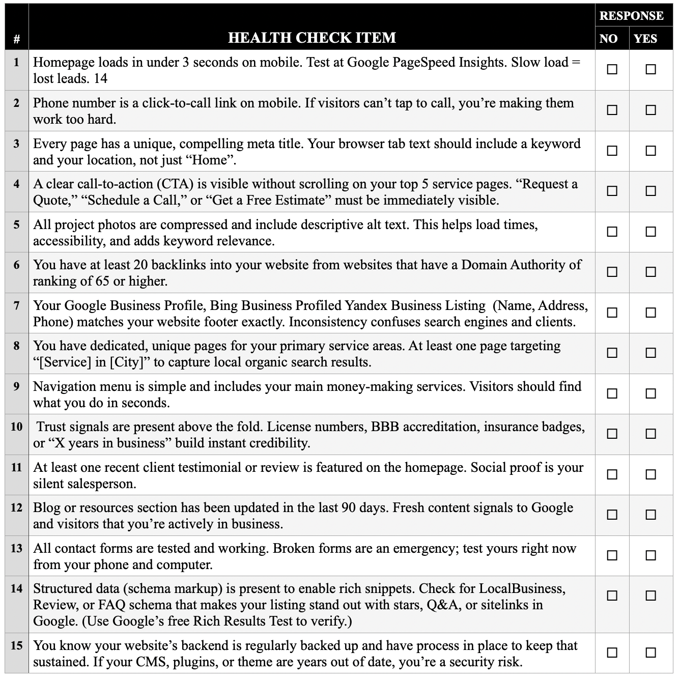 Your score is a diagnostic, not just a number. Take your lowest points and match them to the day-by-day fix sprints from our deep-dive feature Website Admin Hacks: Stand Out and Scale Up. If your biggest misses cluster around speed and design (#1, #5, #6), focus on mechanics first. If the gaps are in content freshness and service-area pages (#8, #12), a content marketing refresh should be your priority.